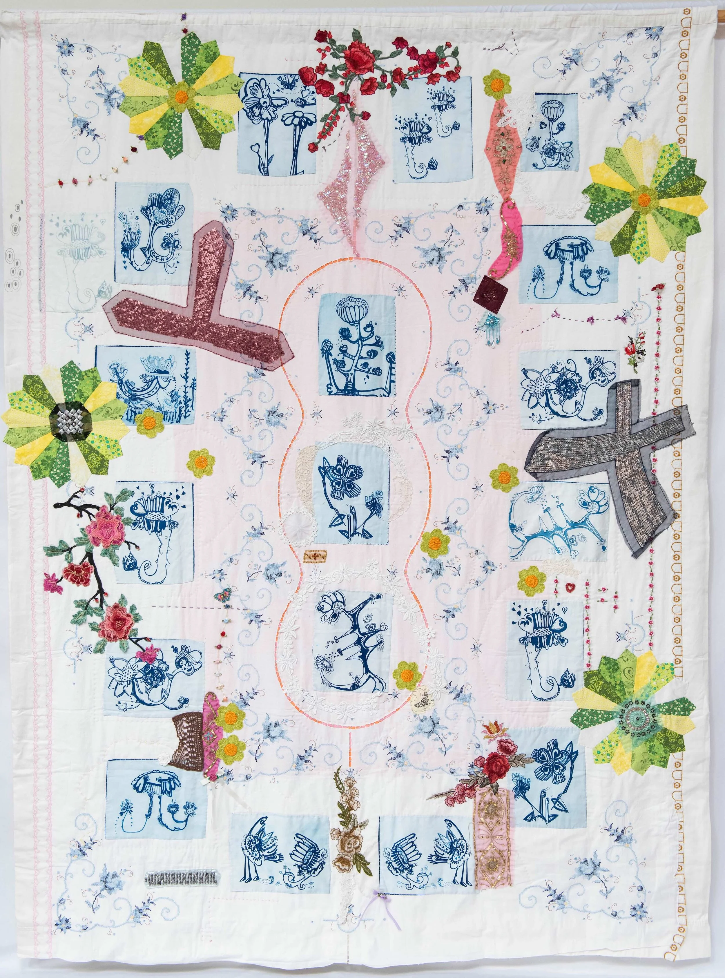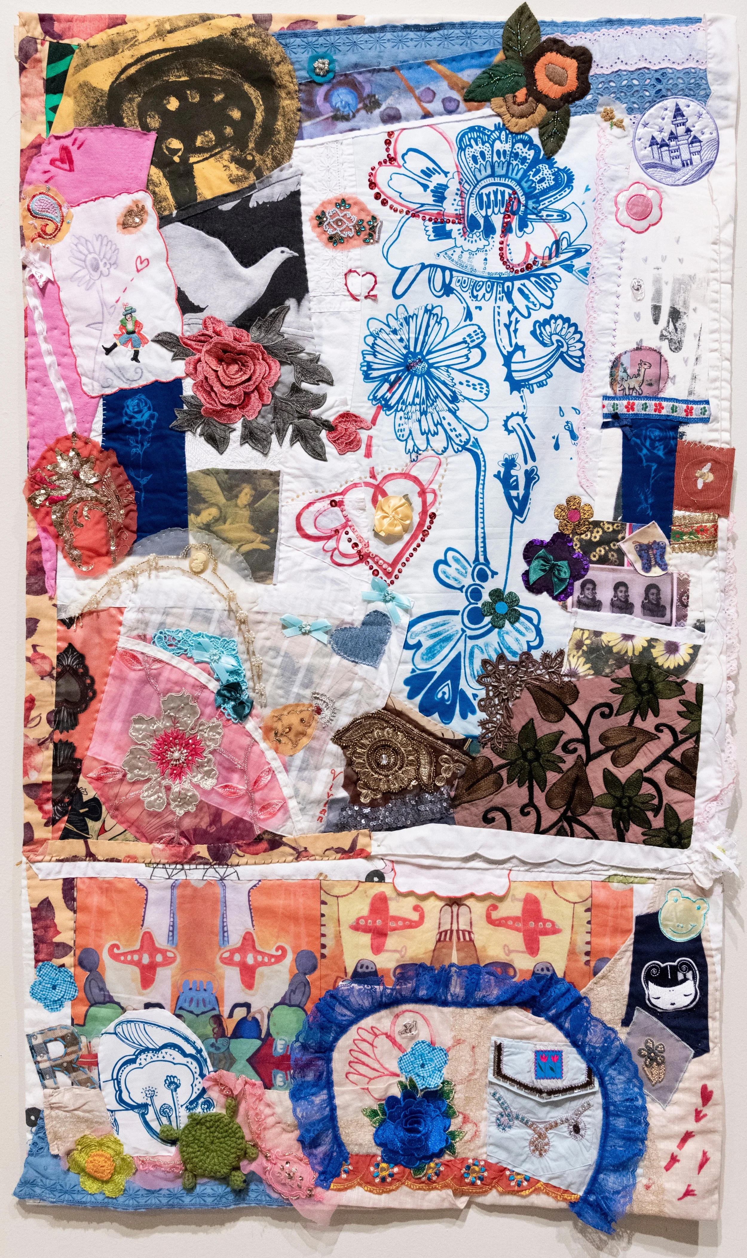 “Houses and Flowers” (2025) Mixed media quilt with dye, appliques, paint, ink, embroidery, beads, sequins, ribbons, and custom printed fabric. 47” x 59” x 1”