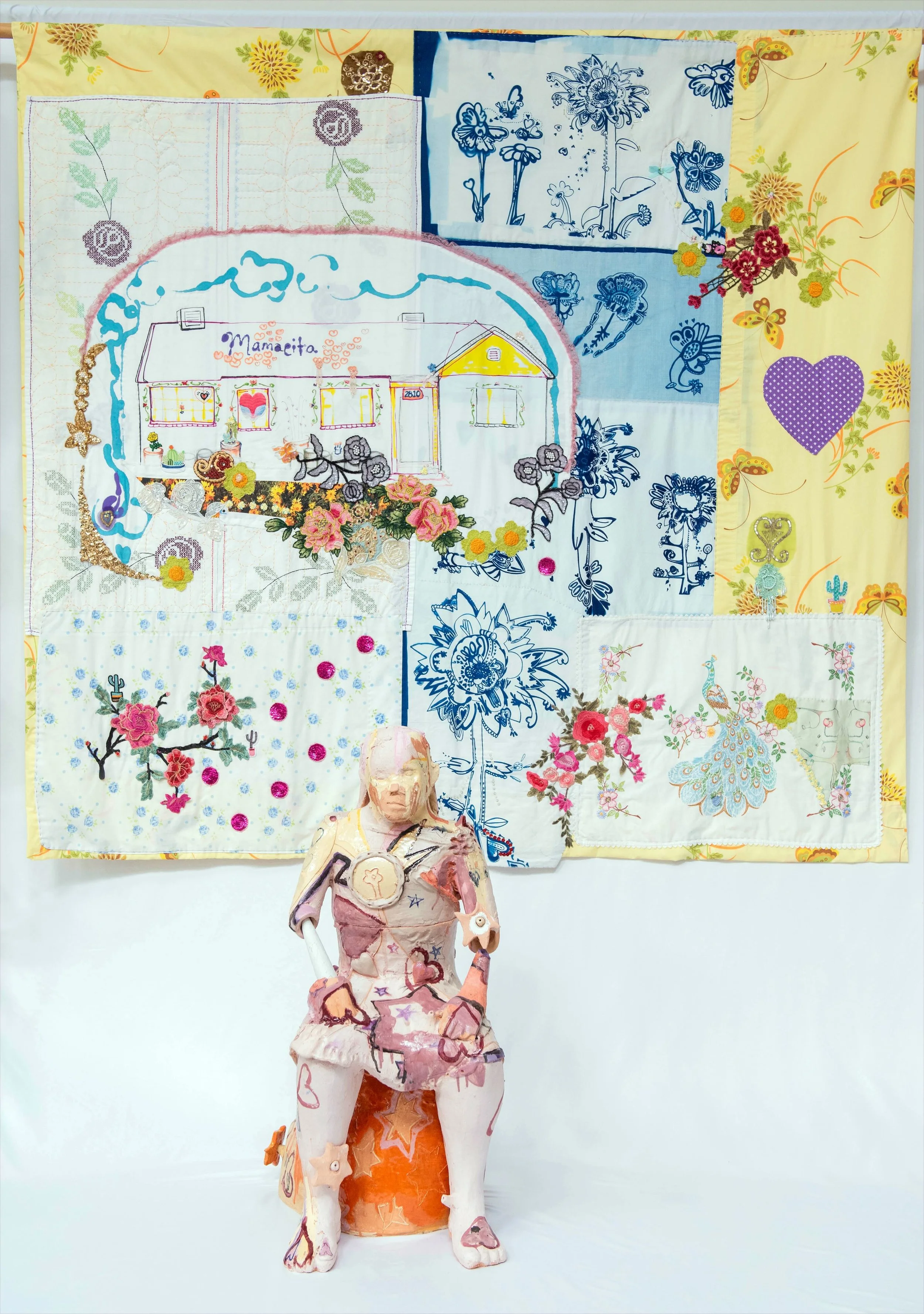 “Star Girl” (2024) ceramic, 37” x 20 × 24” with “Mamacita’s House Quilt” (2023) mixed media quilt with paint, dye, marker, cyanotype drawings, custom printed fabric, appliques, embroidery, beads, and ribbons. 71” x 77”